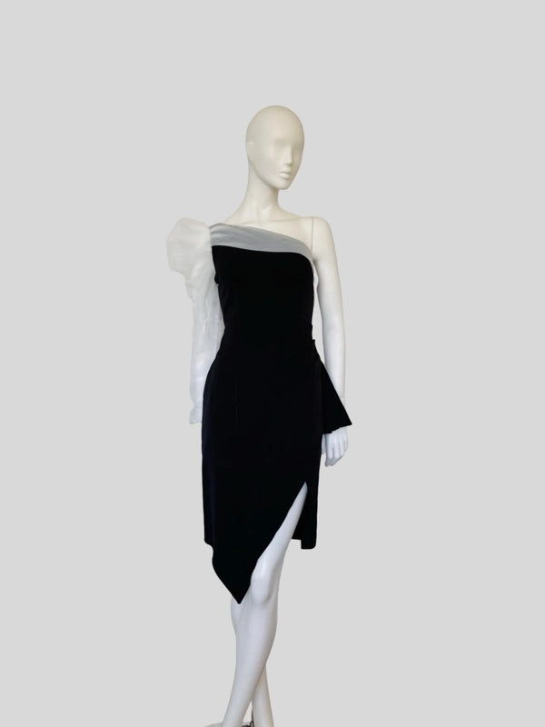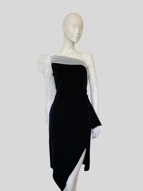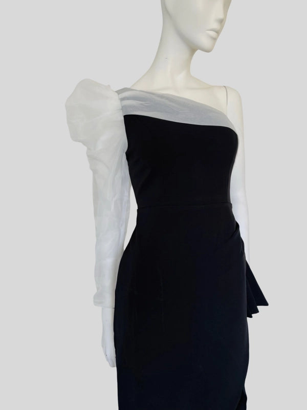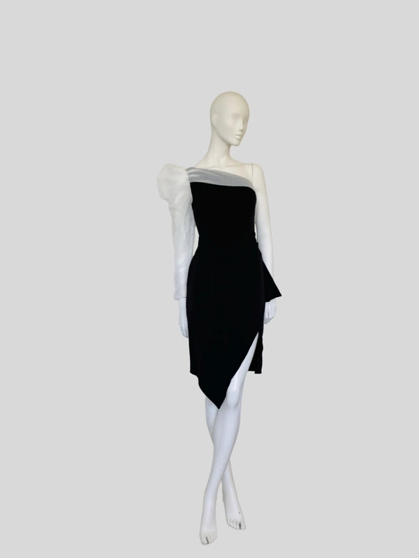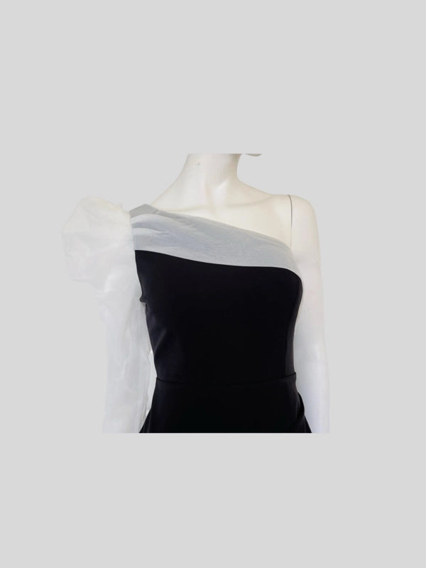 Turn heads with our elegant one-shoulder asymmetrical dress. This sophisticated piece features a chic one-shoulder designed with a sheer long sleeve and an asymmetrical meline that adds a modern twist. Perfect for cocktail parties, evening events, or upscale gatherings.