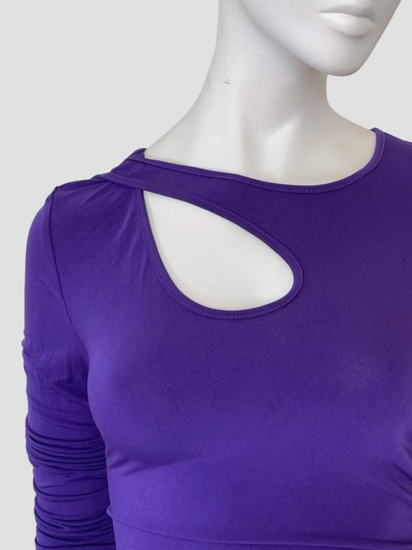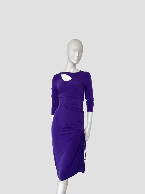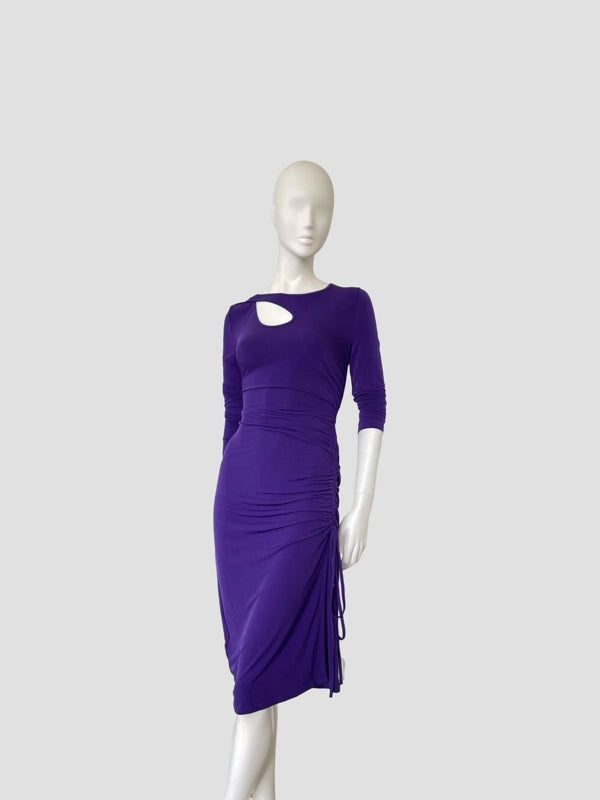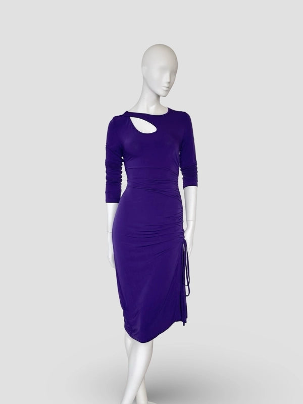 Upgrade your wardrobe with our elegant ruched cutout midi dress, a perfect blend of sophistication and style. Designed with a striking front cutout and side ruching that flatters your figure, this dress exudes timeless elegance.