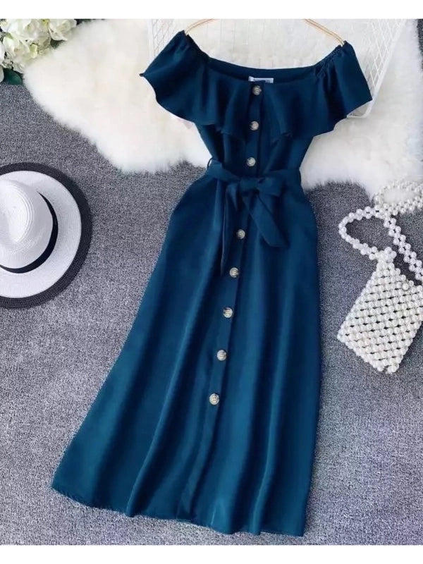 This Captive off-shoulder red midi dress is designed with a flattering ruffle neckline, button down detailing, and a matching waist belt to accentuate your silhouette. Ideal for date nights or special occasions, it's the perfect blend of elegance.