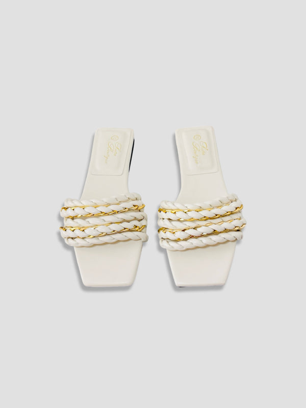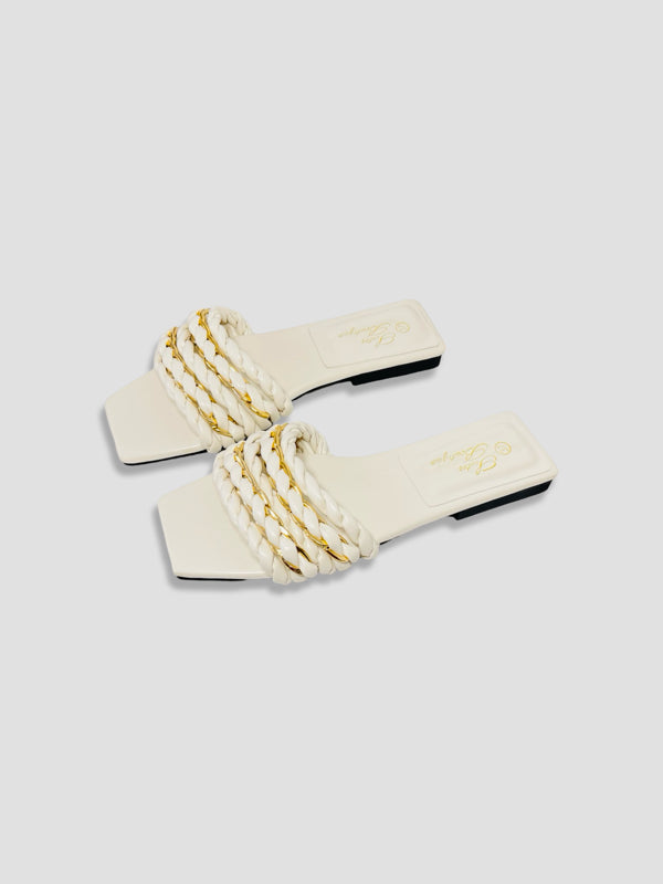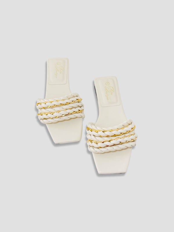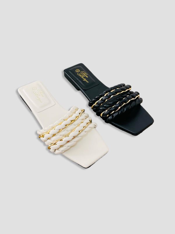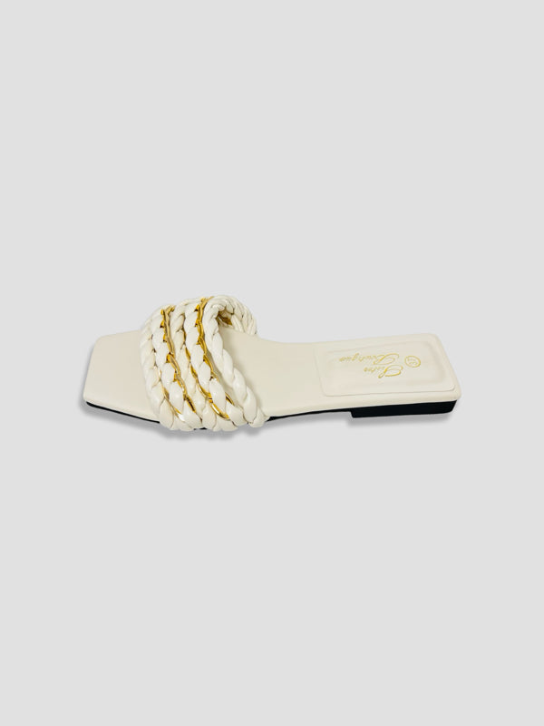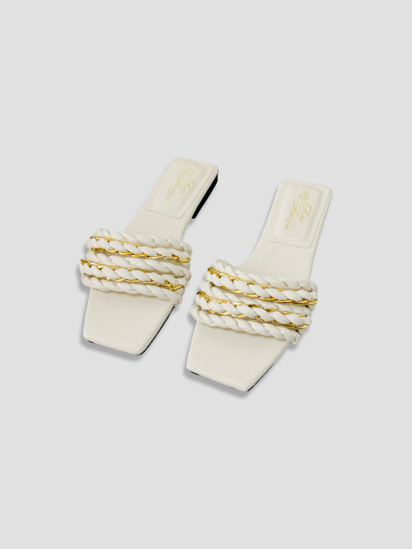 Effortlessly stylish and comfortable, these braided chain-accented slide sandals are designed with a modern square toe and cushioned footbed. The woven straps add a chic touch, while the metallic chain detail elevated the look.