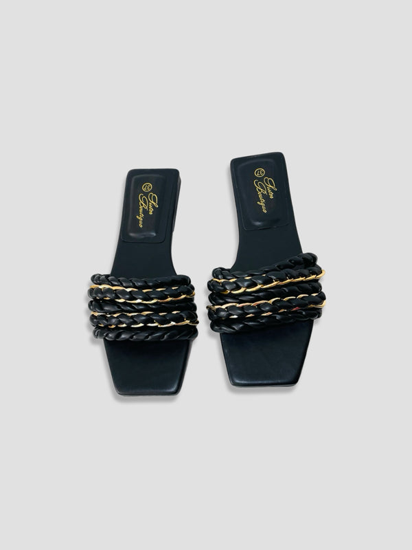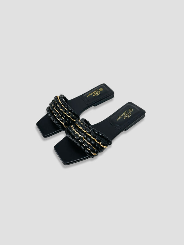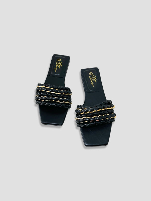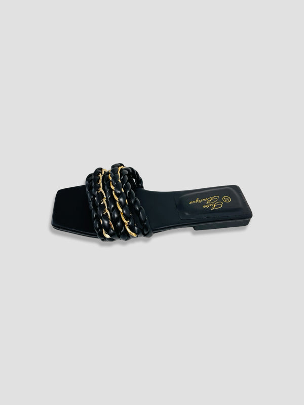 Effortlessly stylish and comfortable, these braided chain-accented slide sandals are designed with a modern square toe and cushioned footbed. The woven straps add a chic touch, while the metallic chain detail elevated the look.