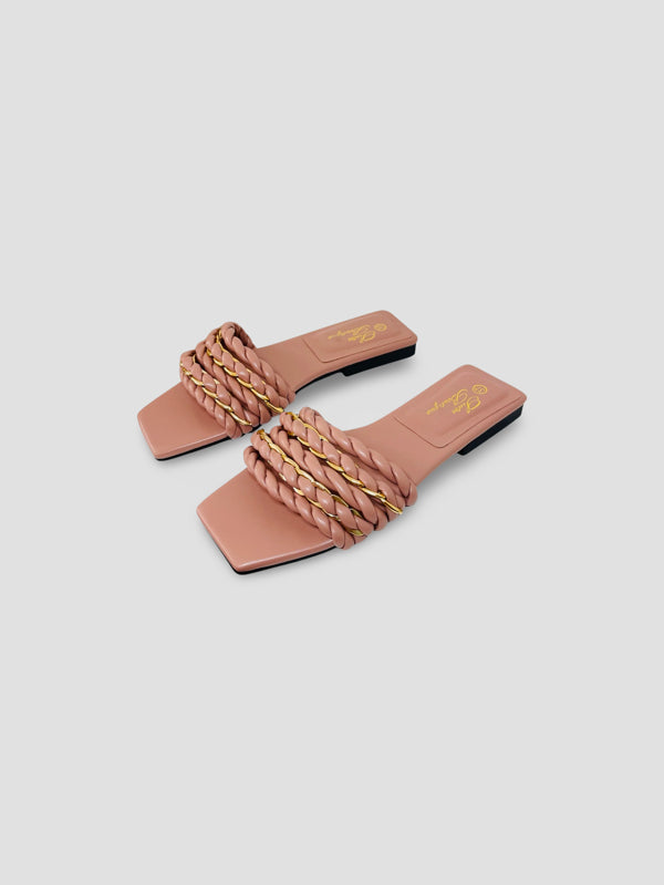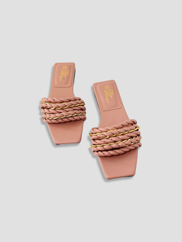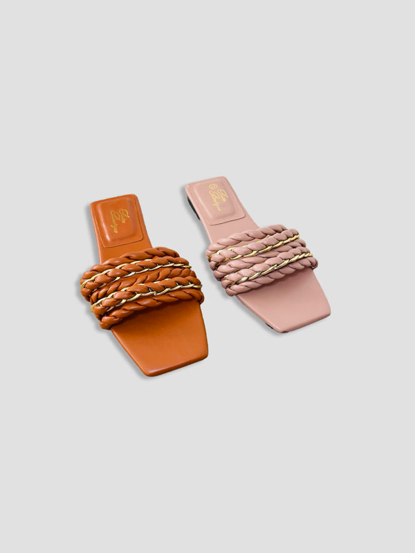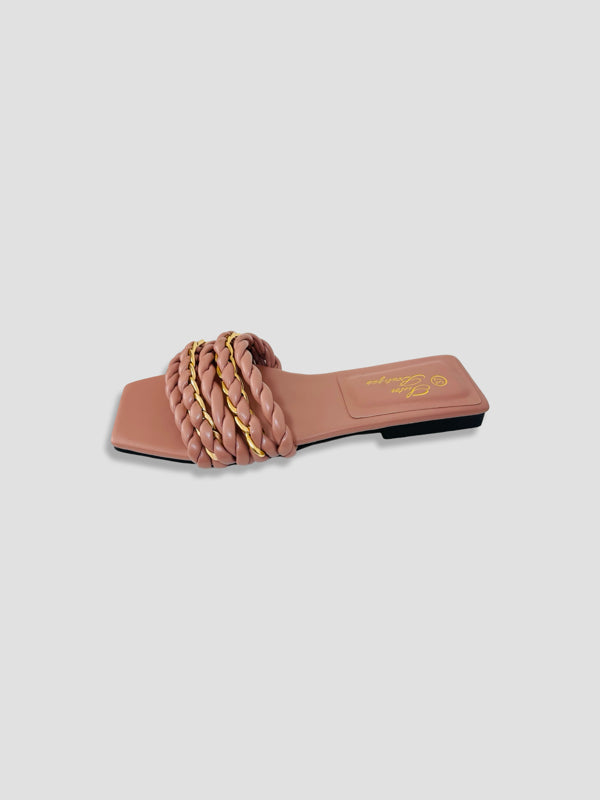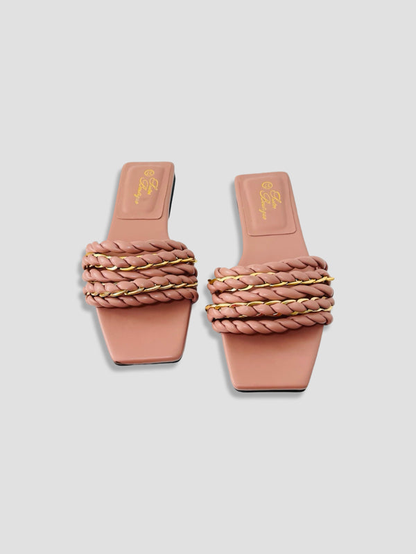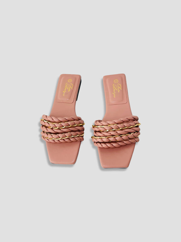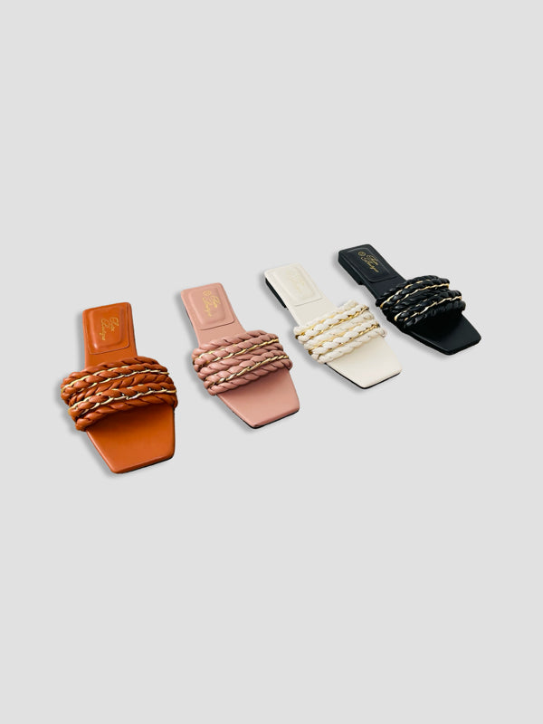 Effortlessly stylish and comfortable, these braided chain-accented slide sandals are designed with a modern square toe and cushioned footbed. The woven straps add a chic touch, while the metallic chain detail elevated the look.