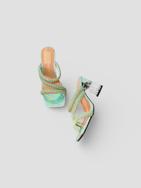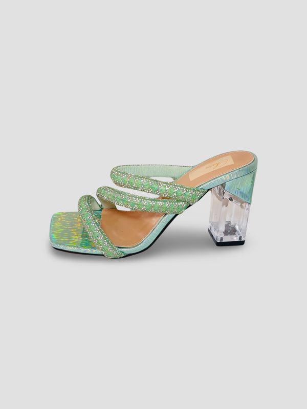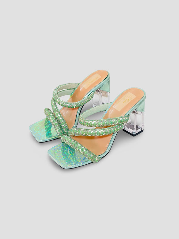 Step out in style with these stunning crystal-embellished mules featuring a trendy strappy design and clear block heels. Perfect for adding sparkle to your evening or casual looks, these sandals offer both comfort and elegance for any occasion.