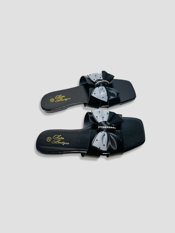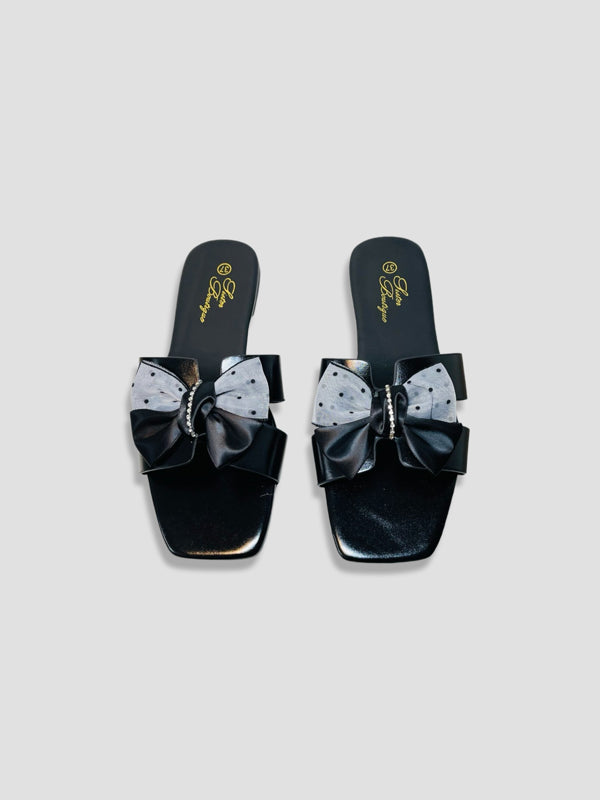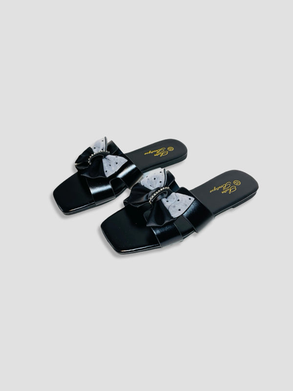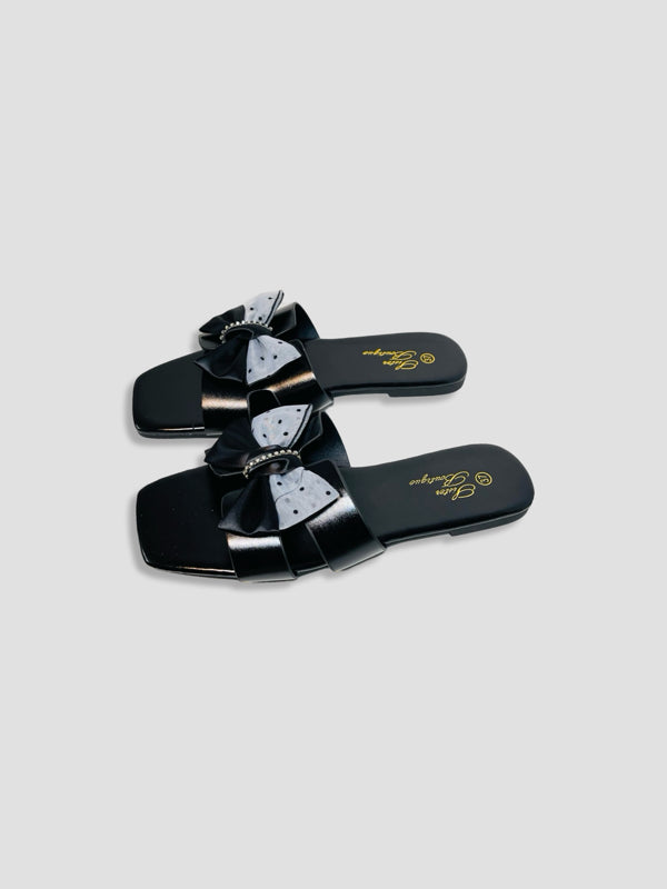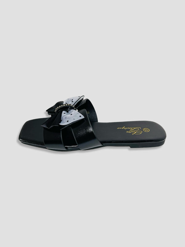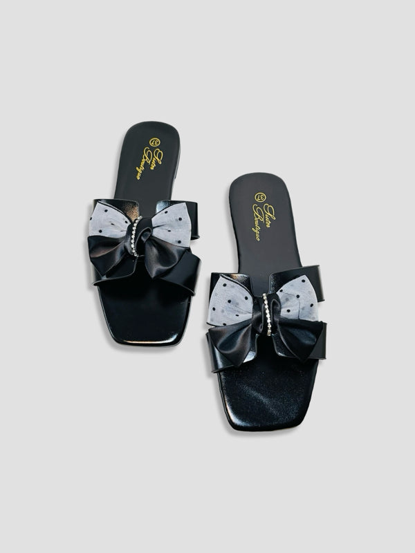 Feminine flat slides with a charming polka dot bow, ideal for casual outings and warm-weather wear.