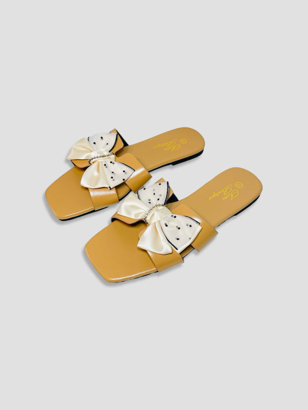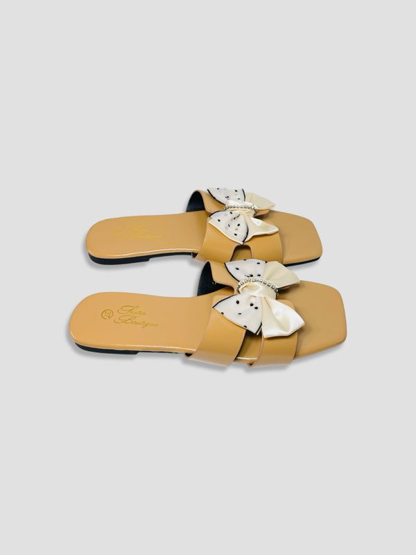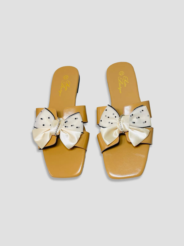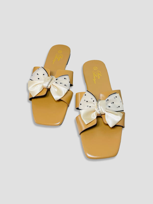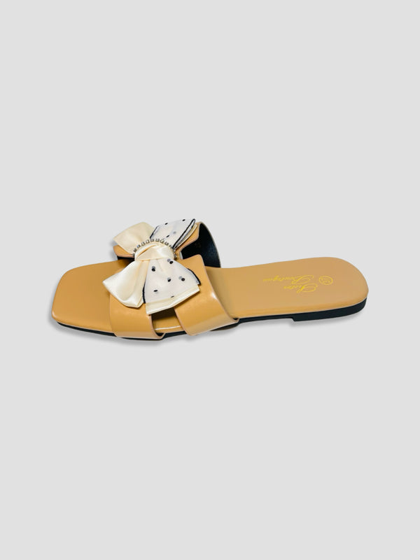 Feminine flat slides with a charming polka dot bow, ideal for casual outings and warm-weather wear.