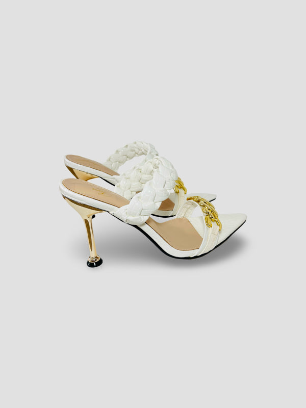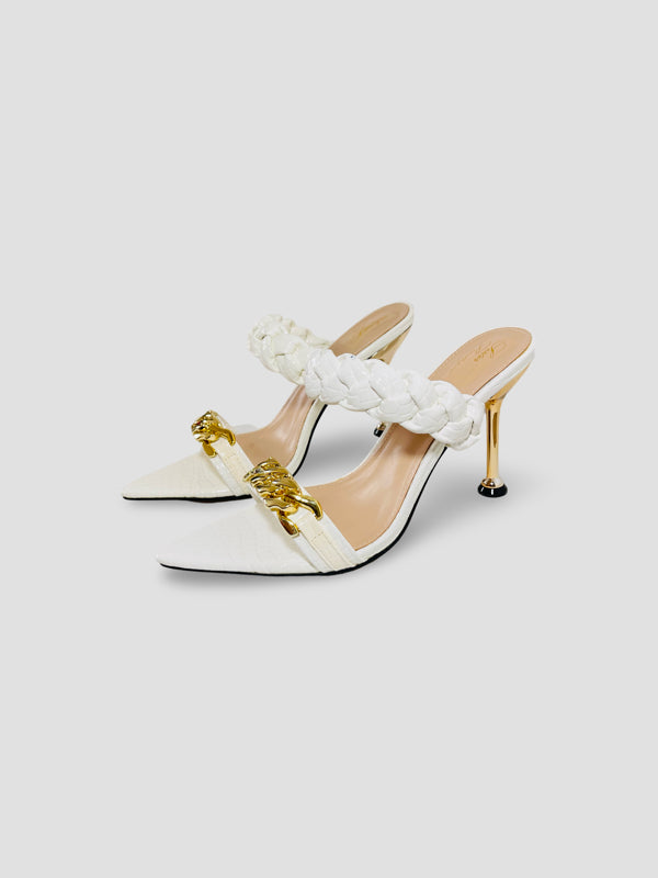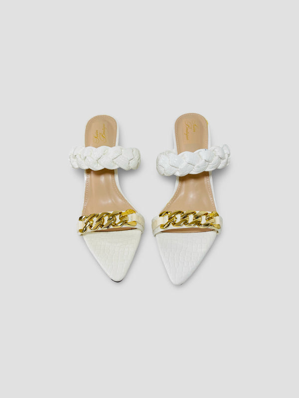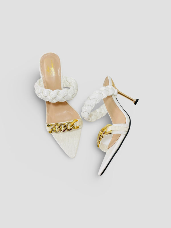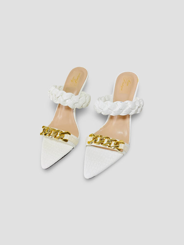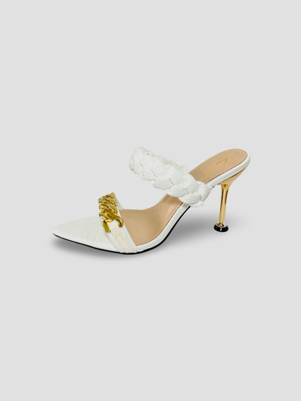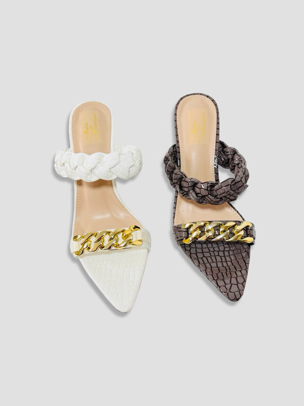Elevate your look with these chic braided mule heels, featuring a croc-embossed texture and bold gold chain detail. the pointed toe and slip-on design offer both elegance and comfort, making them the perfect statement piece for any occasion.