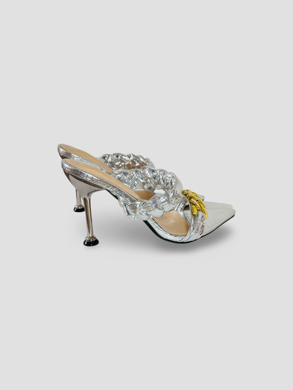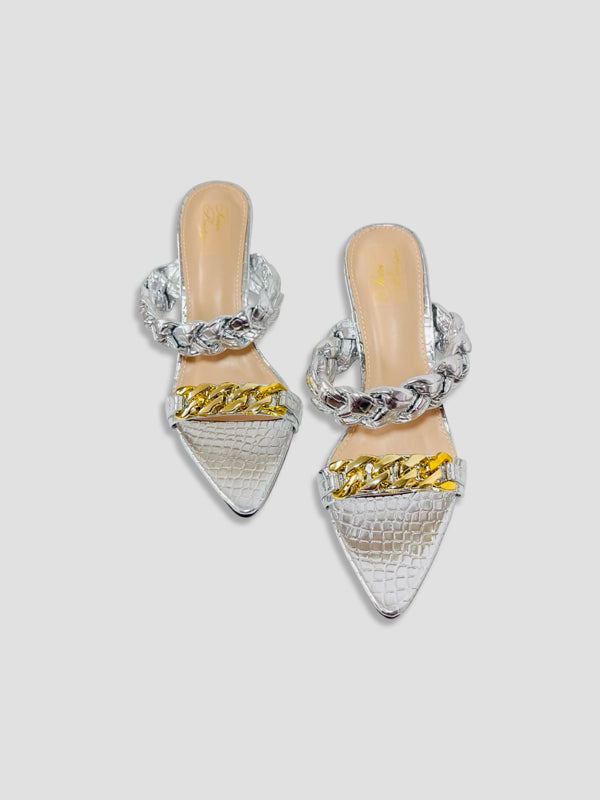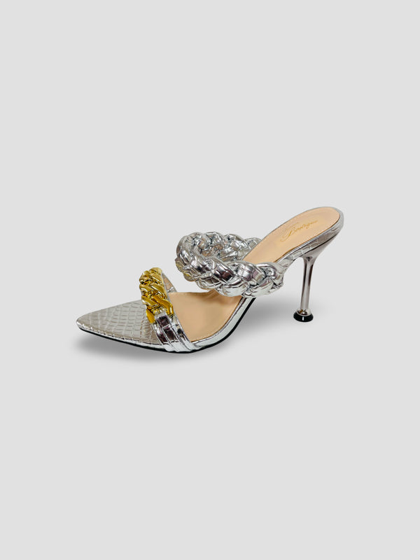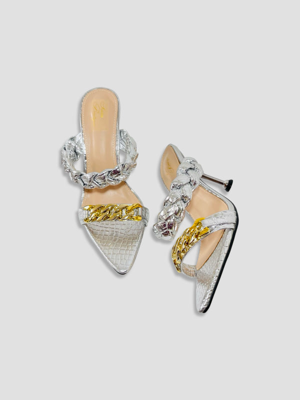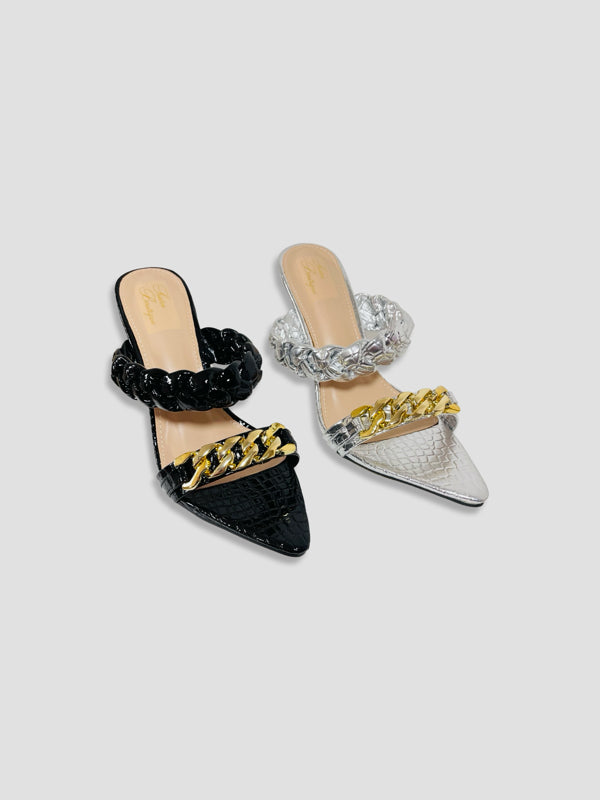 Elevate your look with these chic braided mule heels, featuring a croc-embossed texture and bold gold chain detail. the pointed toe and slip-on design offer both elegance and comfort, making them the perfect statement piece for any occasion.