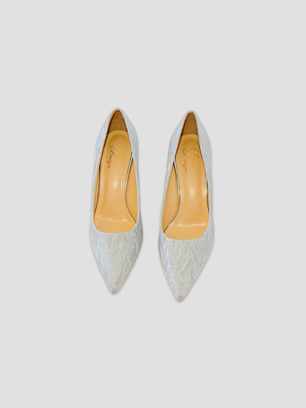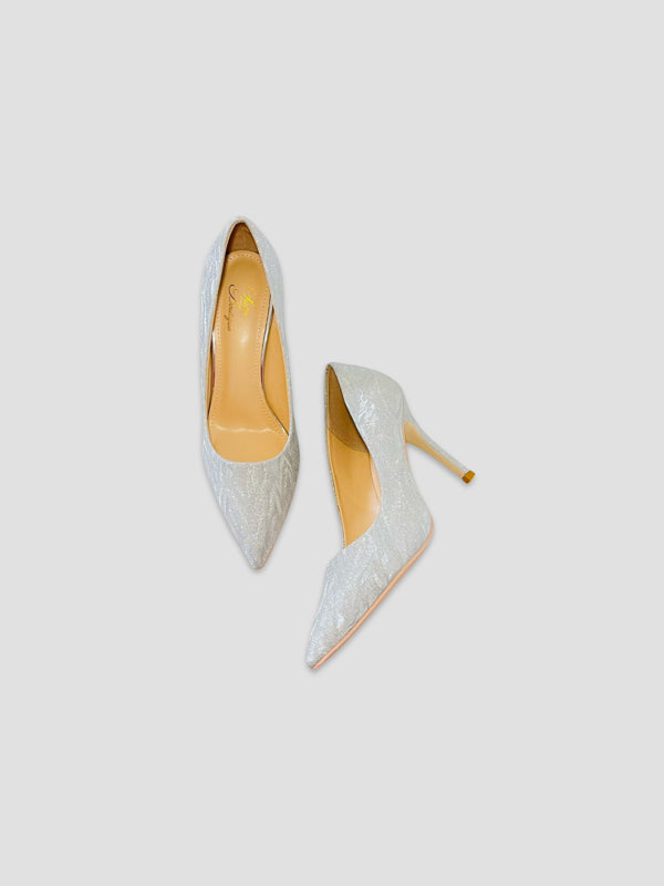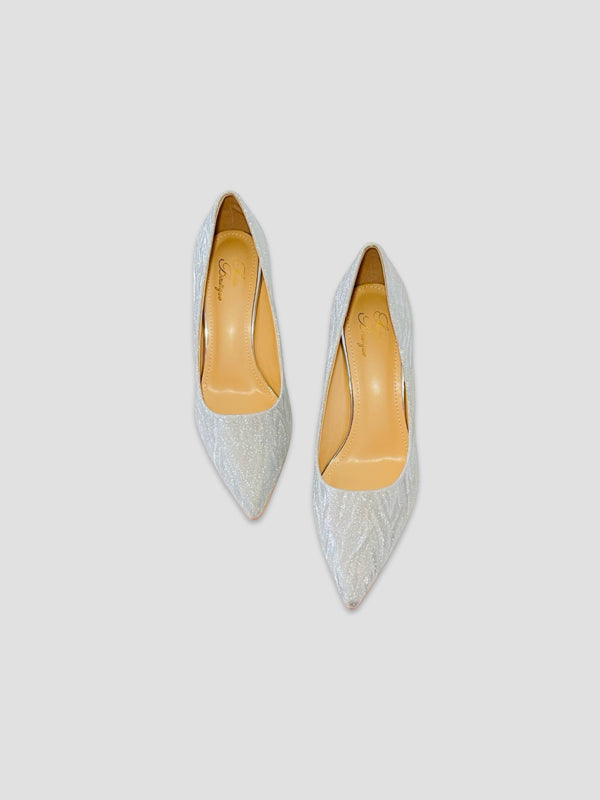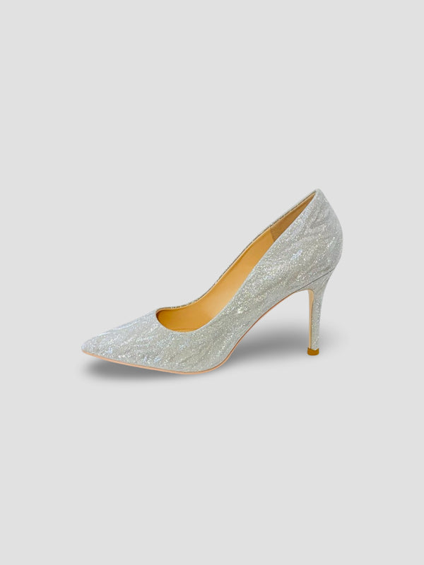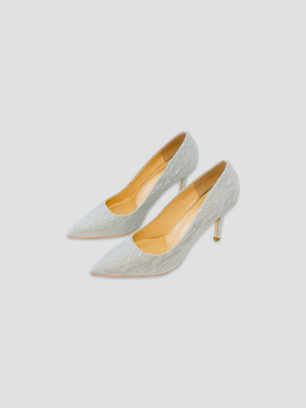 These elegant silver glitter stiletto pumps are perfect for parties or special occasions, offering a sleek and sparkling finish that adds a touch of glamour to any outfit.