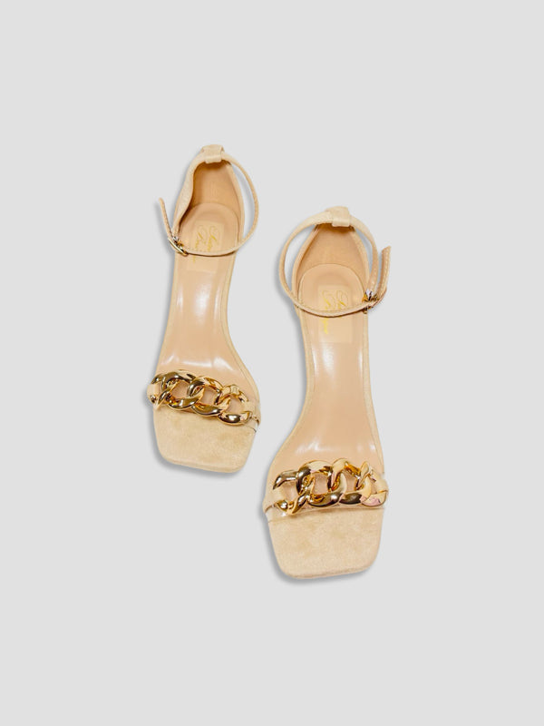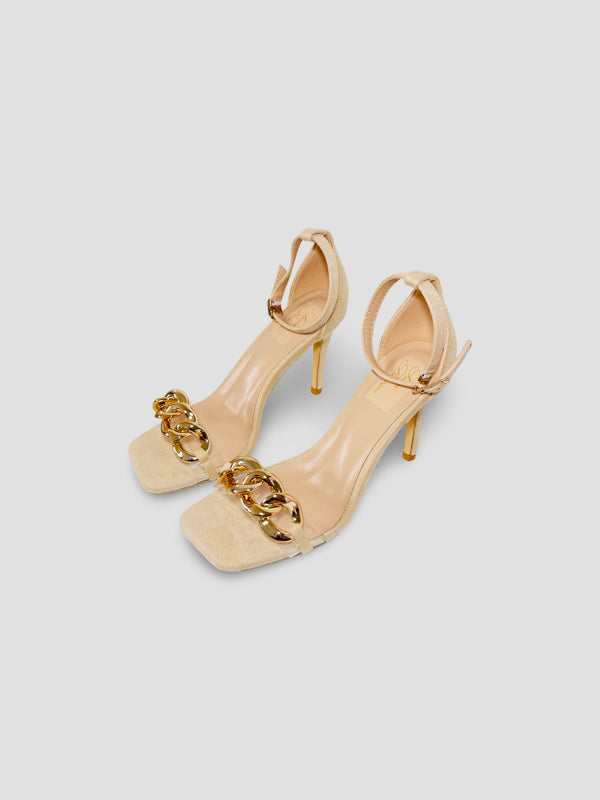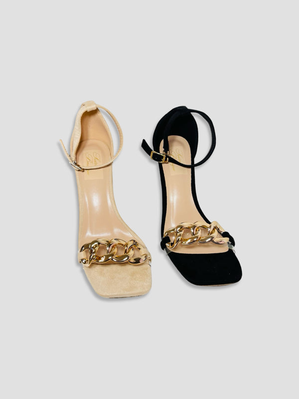 Stylish heels with a statement gold chain across the front and a secure ankle strap. Designed for both elegance and comfort, perfect for day-to-night wear.