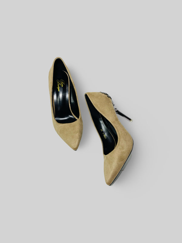 Elegant stiletto heels featuring a gold-accented heel, available in glitter and suede.