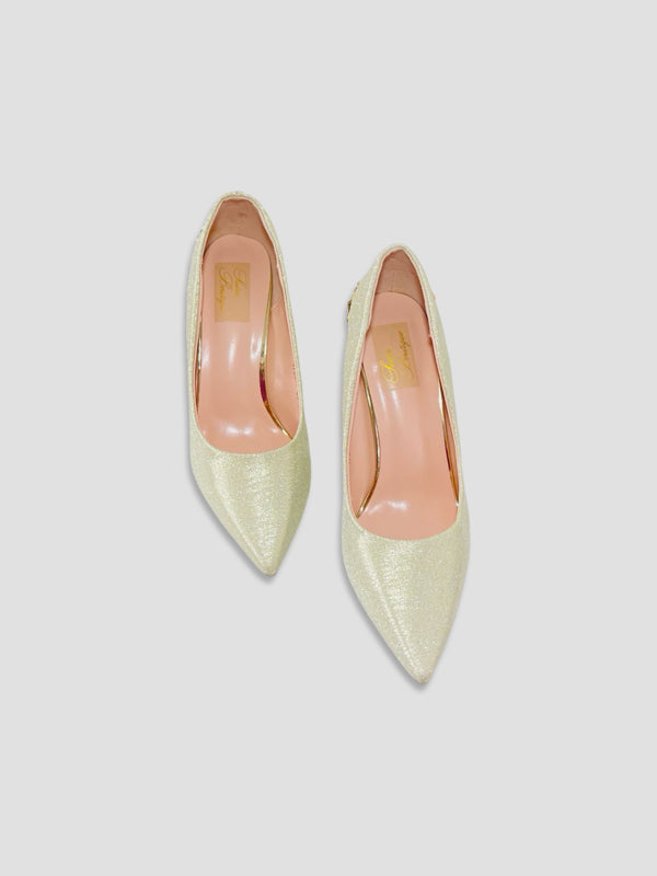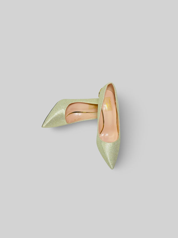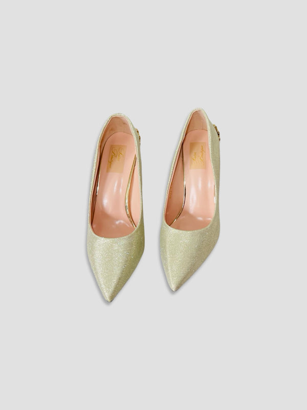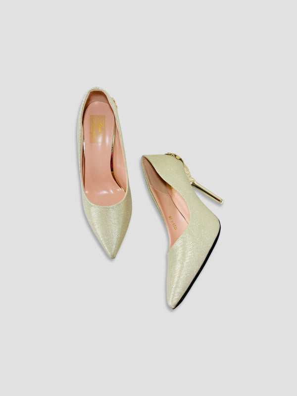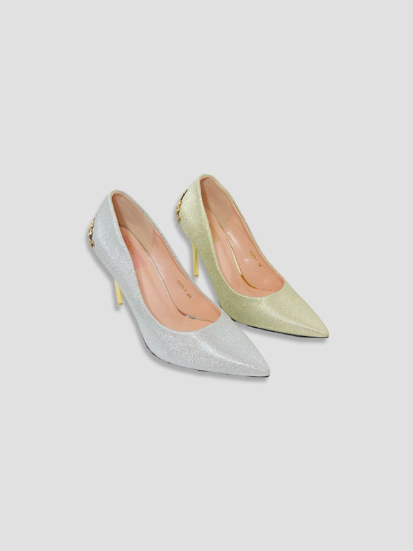 Elegant stiletto heels featuring a gold-accented heel, available in glitter and suede.