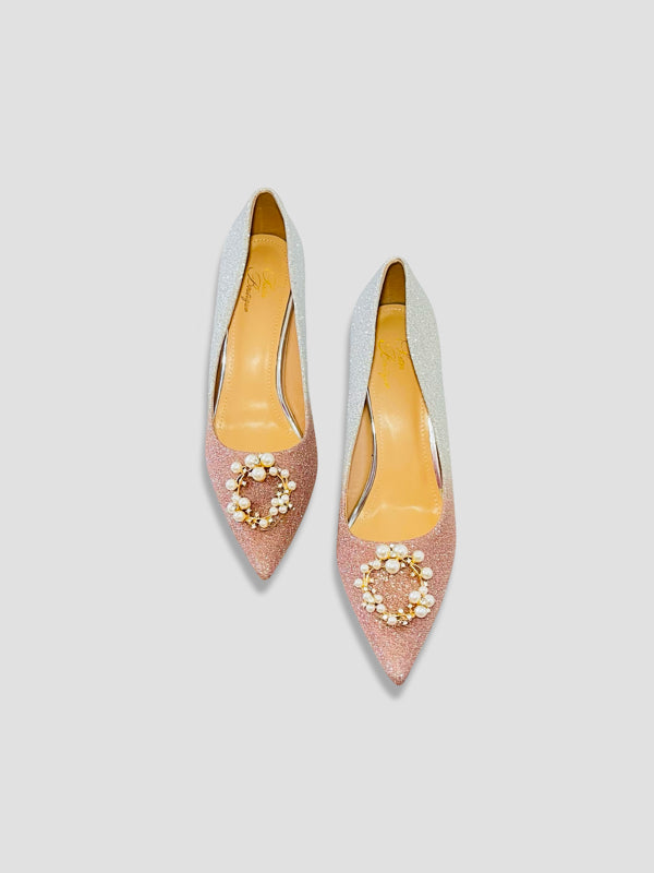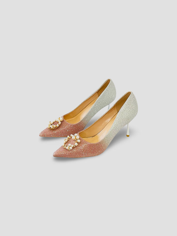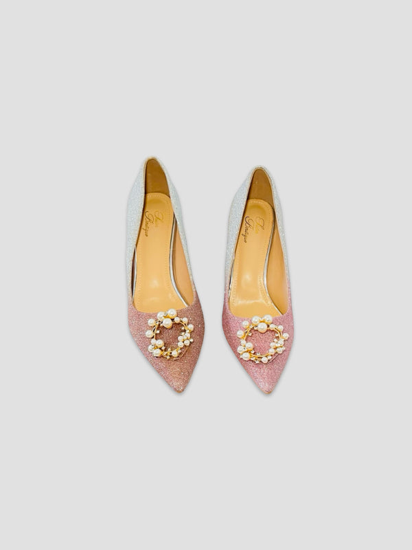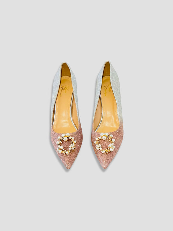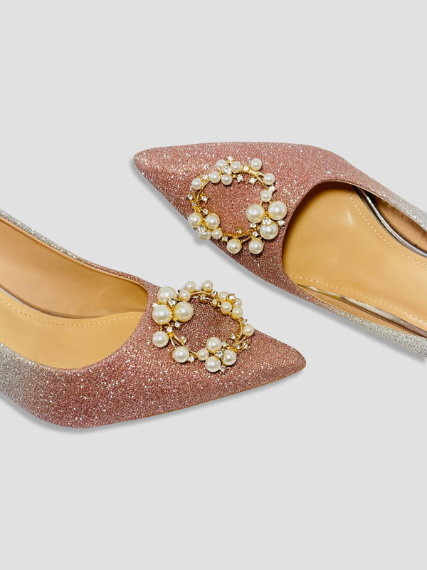 These stunning pink and silver glitter stiletto heels feature exquisite pearl embellishments, combining elegance and sparkle for a luxurious statement. perfect for weddings, parties, or any special occasion where you want to shine.