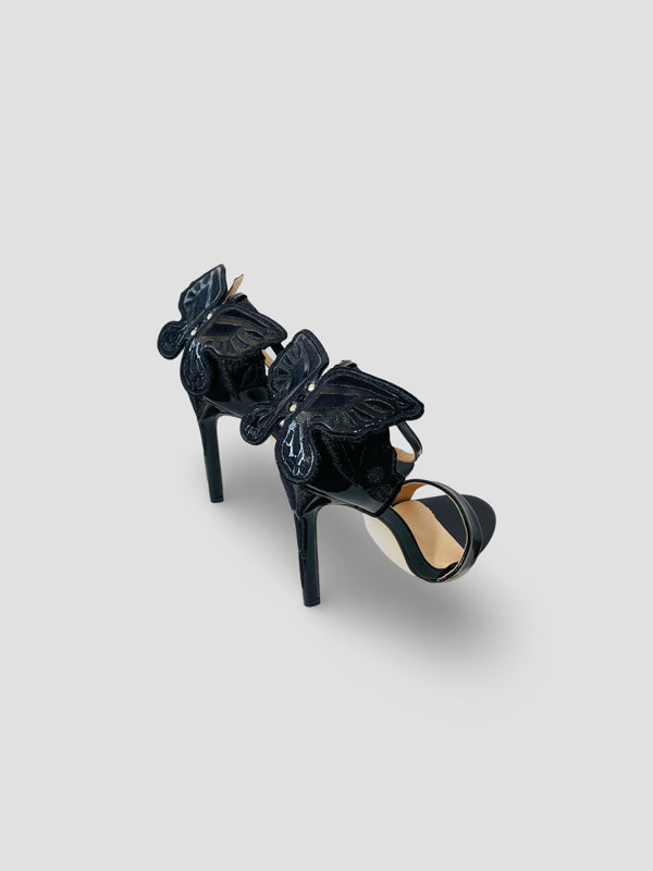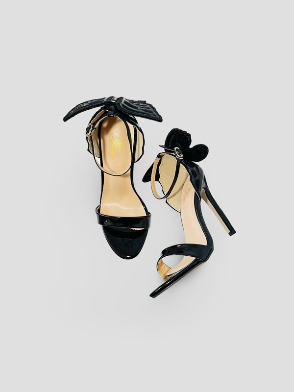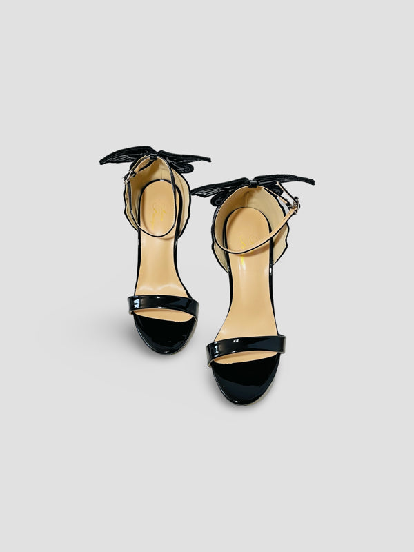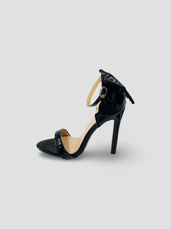These black patent stiletto heels feature a sleek ankle strap and charming bow detail, perfect for adding a touch of butterflies elegance to any outfit. With a glossy finish and high-heel design, they are ideal for special occasions, parties, or nights out, combining style and sophistication with comfort.