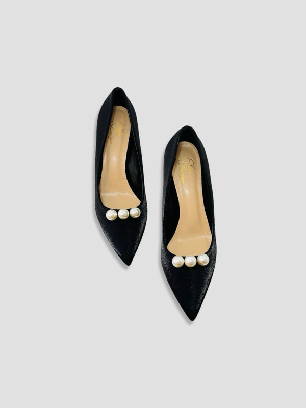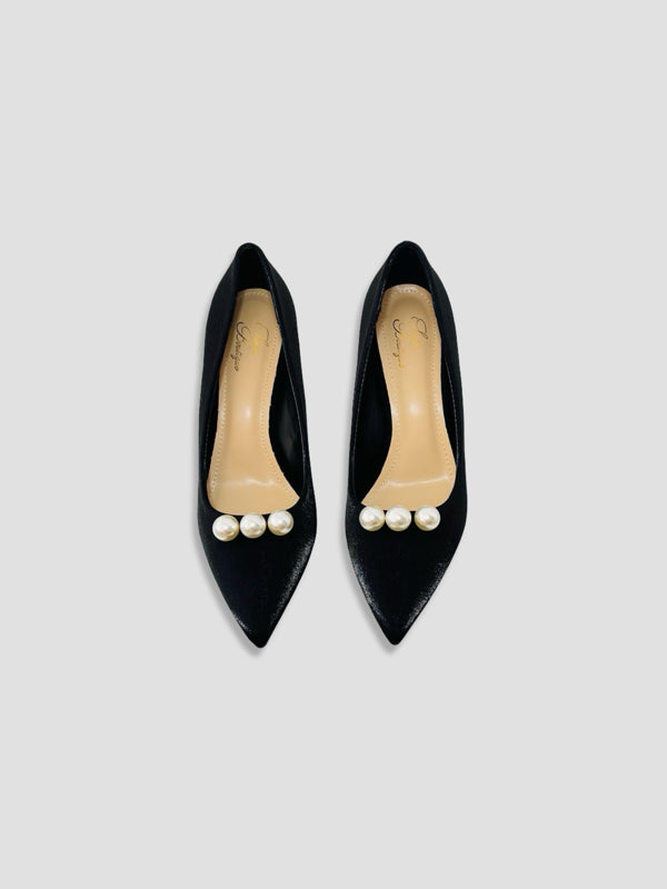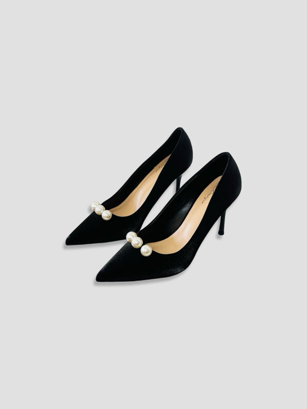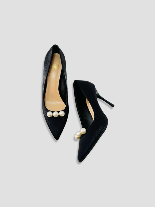 This elegant satin pumps, available in striking red or soft Nude blush, are adorned with a bold pearl detail at the toe.