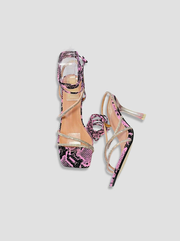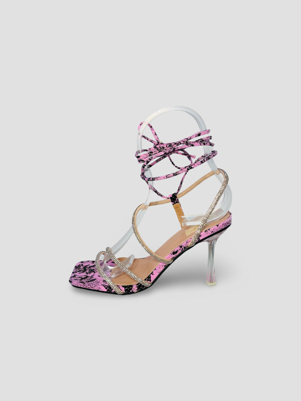 Bold and stylish, these snake print high-heel sandals feature clear straps and an ankle wrap design, perfect for a night out or adding a statement touch to any outfit.
