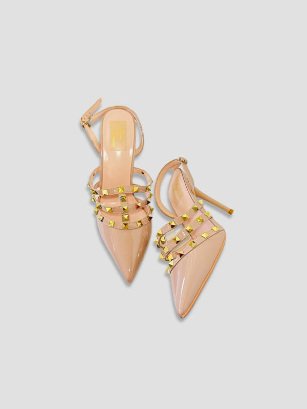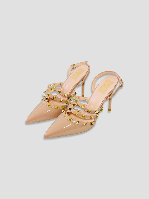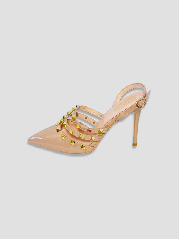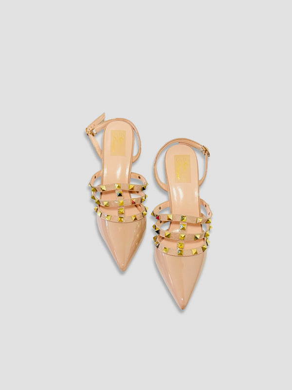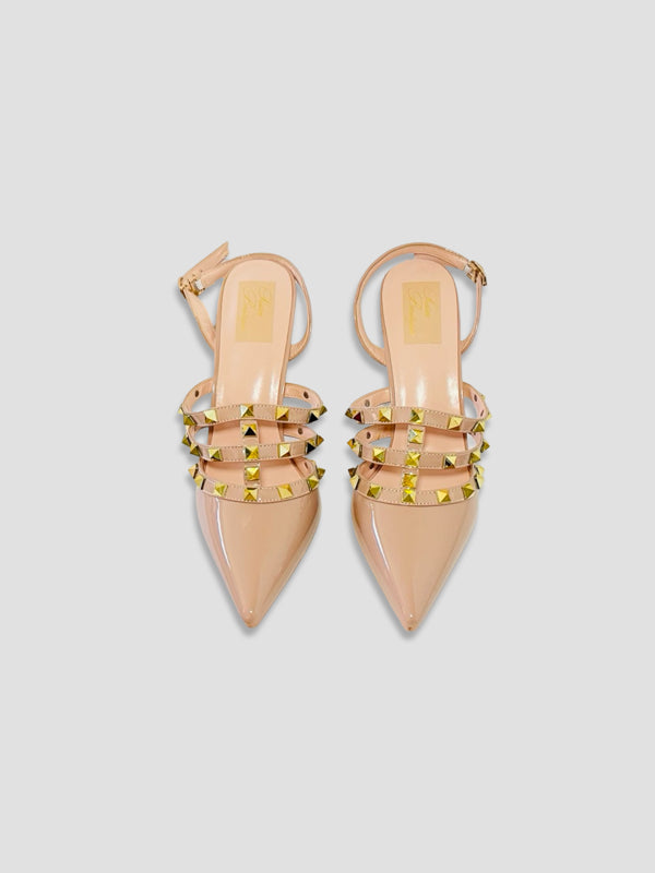 Chic black patent leather slingbacks with nude straps, featuring edgy gold studs for a bold, modern look. perfect for elevating any outfit.