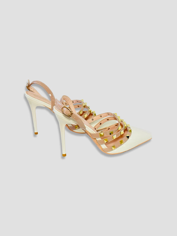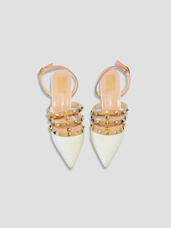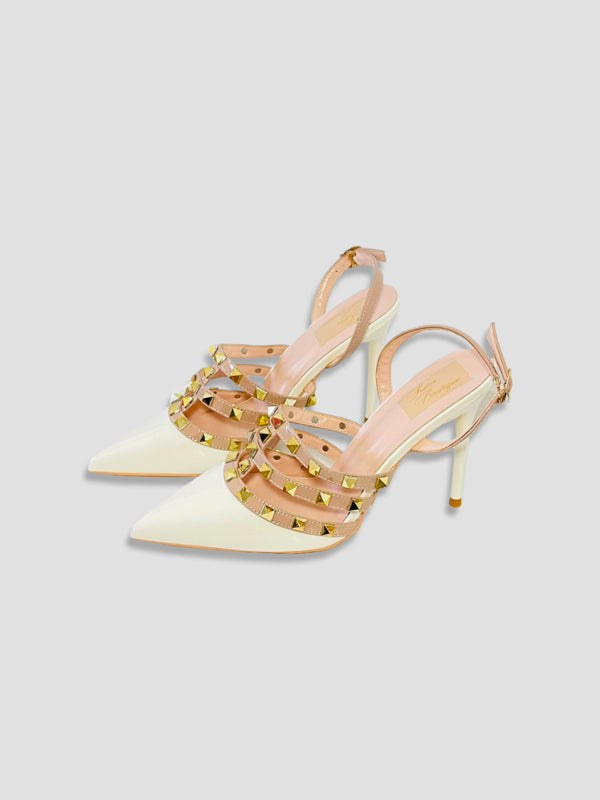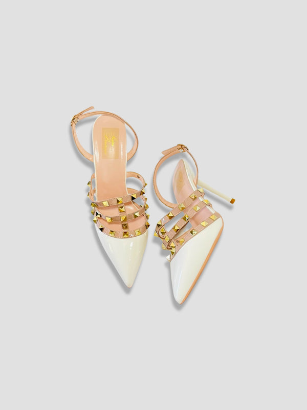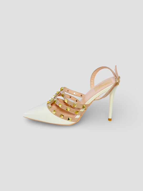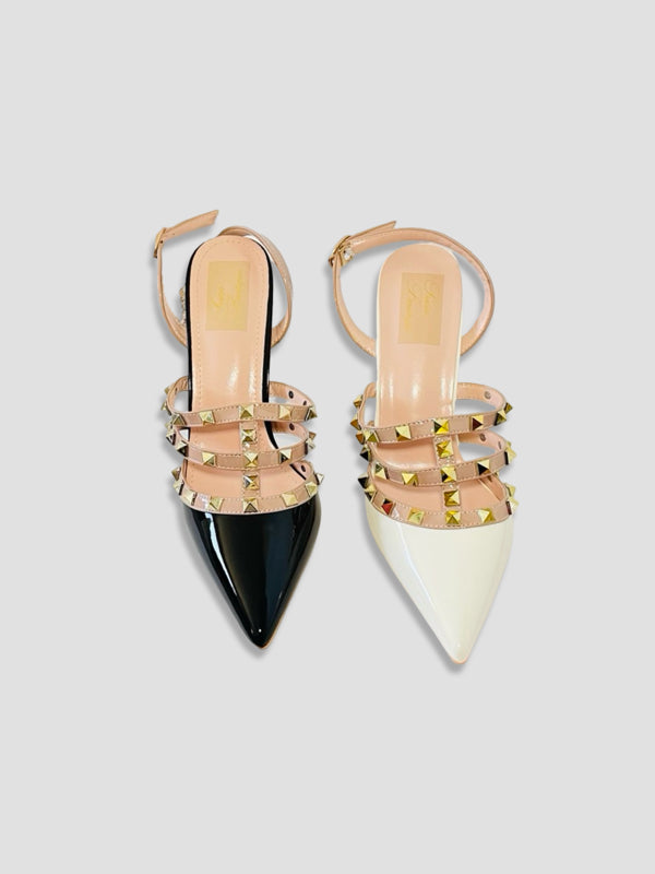 Chic black patent leather slingbacks with nude straps, featuring edgy gold studs for a bold, modern look. perfect for elevating any outfit.